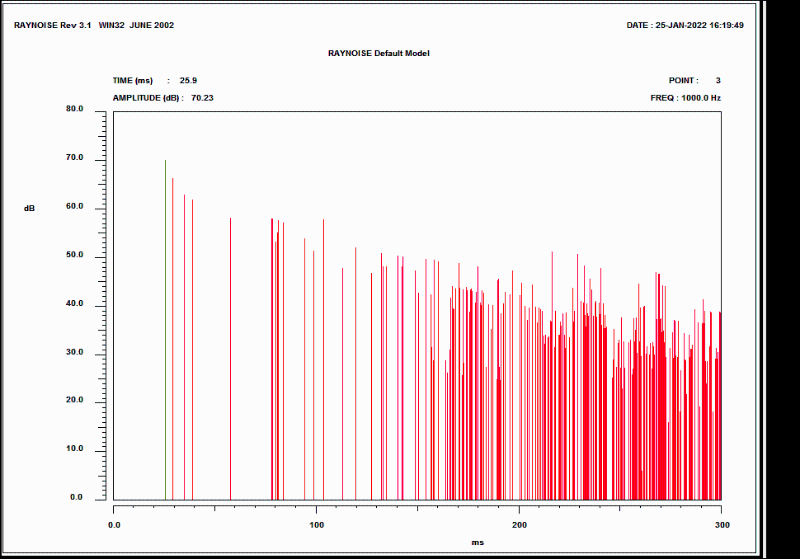 从计算机仿真模拟结果可以看出,T30云图分布较均匀,各接收点的平均混响时间中频(500 Hz、1 000 Hz)平均值为1.14 s,空场计算值为1.16 s,计算机模拟结果和计算结果较符合,混响时间频率特性一致。并且从选取的接收点反射声序列图可以看出各点无回声音质缺陷。